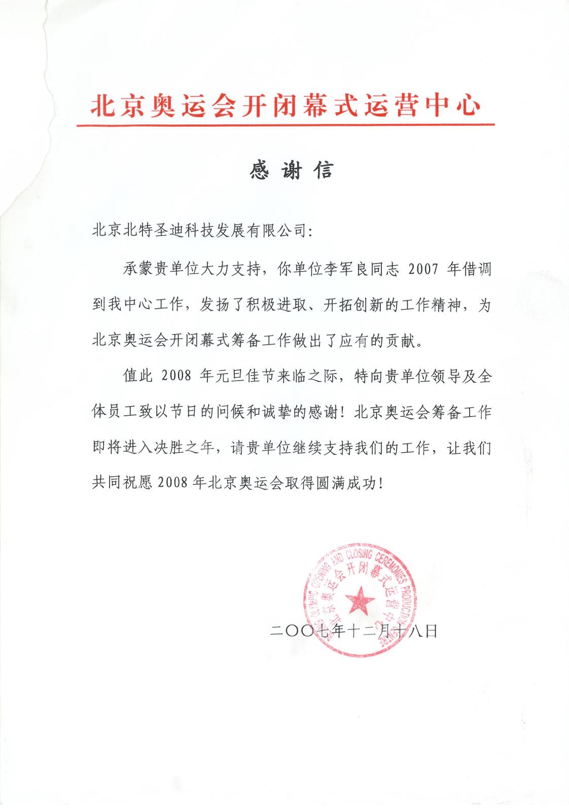 北京奧運(yùn)會(huì)開閉幕式籌備工作感謝信(李軍良)