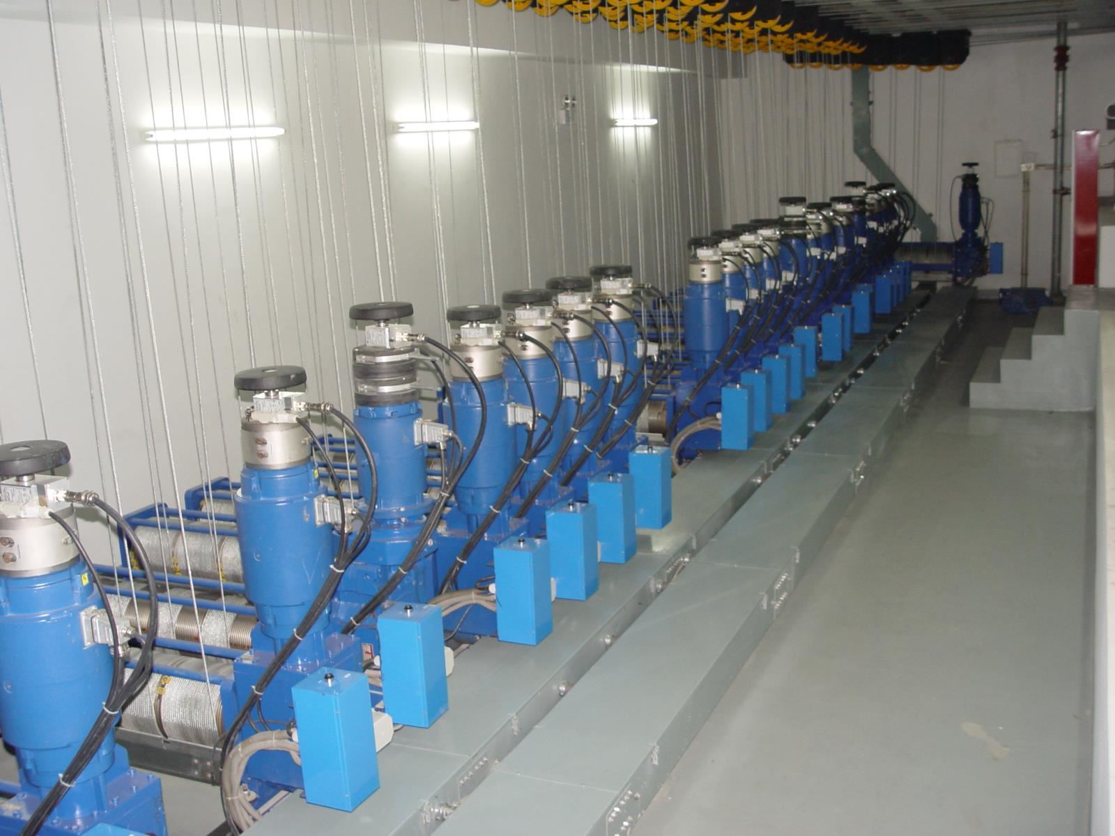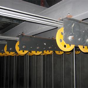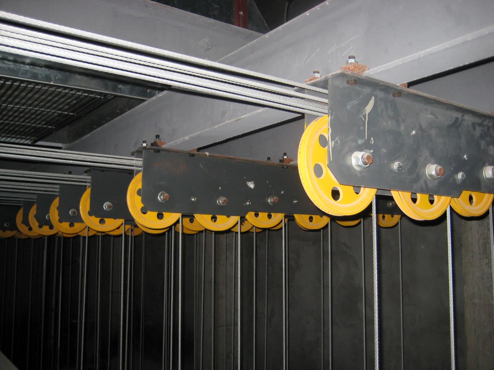 卷揚系統(tǒng):包括電動機、減速器、雙制動器、卷筒、滑輪組件、鋼絲繩和配件、輔助操作手輪等?;喗M件(一般)包括拐角滑輪、吊點滑輪。