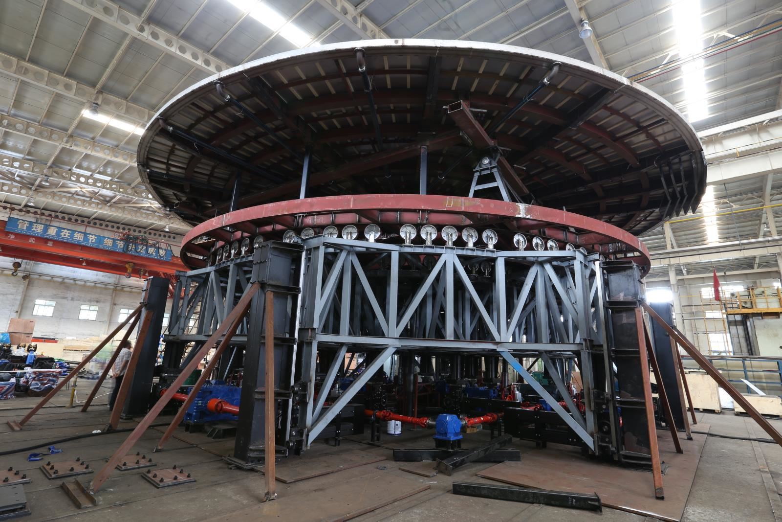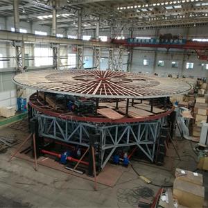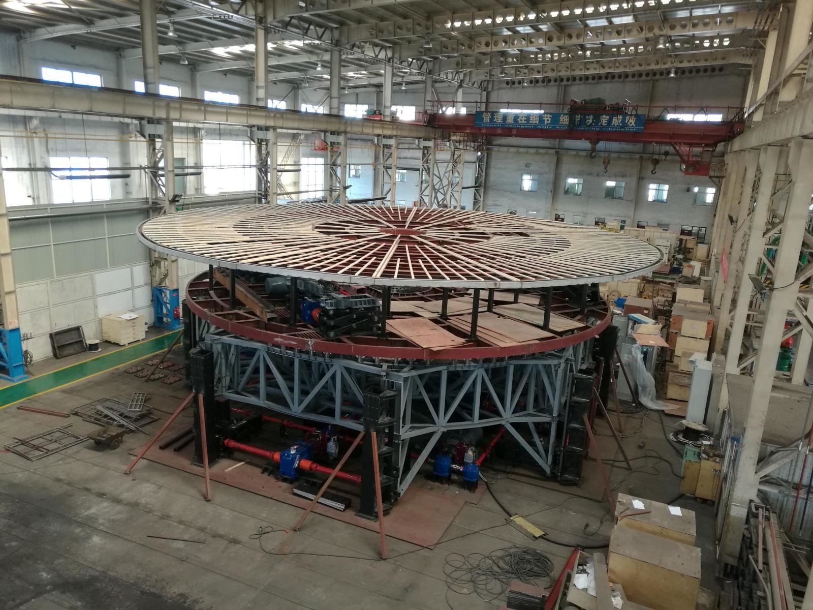舞臺(tái)升降機(jī)是節(jié)目(秀)的一個(gè)重要布景元素,為單層結(jié)構(gòu),行程: -5.60m至 -3.60m,總行程為2.0m。舞臺(tái)升降機(jī)的頂面將沿著單一軸線從水平位置傾斜10度。整個(gè)頂面可以連續(xù)旋轉(zhuǎn)。升降機(jī)可提供持續(xù)的電源,升降機(jī)下方配備工作照明。所有配電線路在升降機(jī)框架內(nèi)的導(dǎo)管中運(yùn)行。升降機(jī)的頂面為防漏不銹鋼底盤。底盤向中心填充點(diǎn)傾斜 10mm/m;外加8mm的地板表面材料,結(jié)合至 25mm PVC 板材。底盤外緣是一個(gè)連續(xù)的環(huán)形溢流排水口。圍繞舞臺(tái)升降機(jī)是一個(gè)環(huán)形無邊水效果。在周邊平臺(tái)盤中有非吸水性地板材料,坡度也是 12mm/m,與舞臺(tái)升降機(jī)相配。