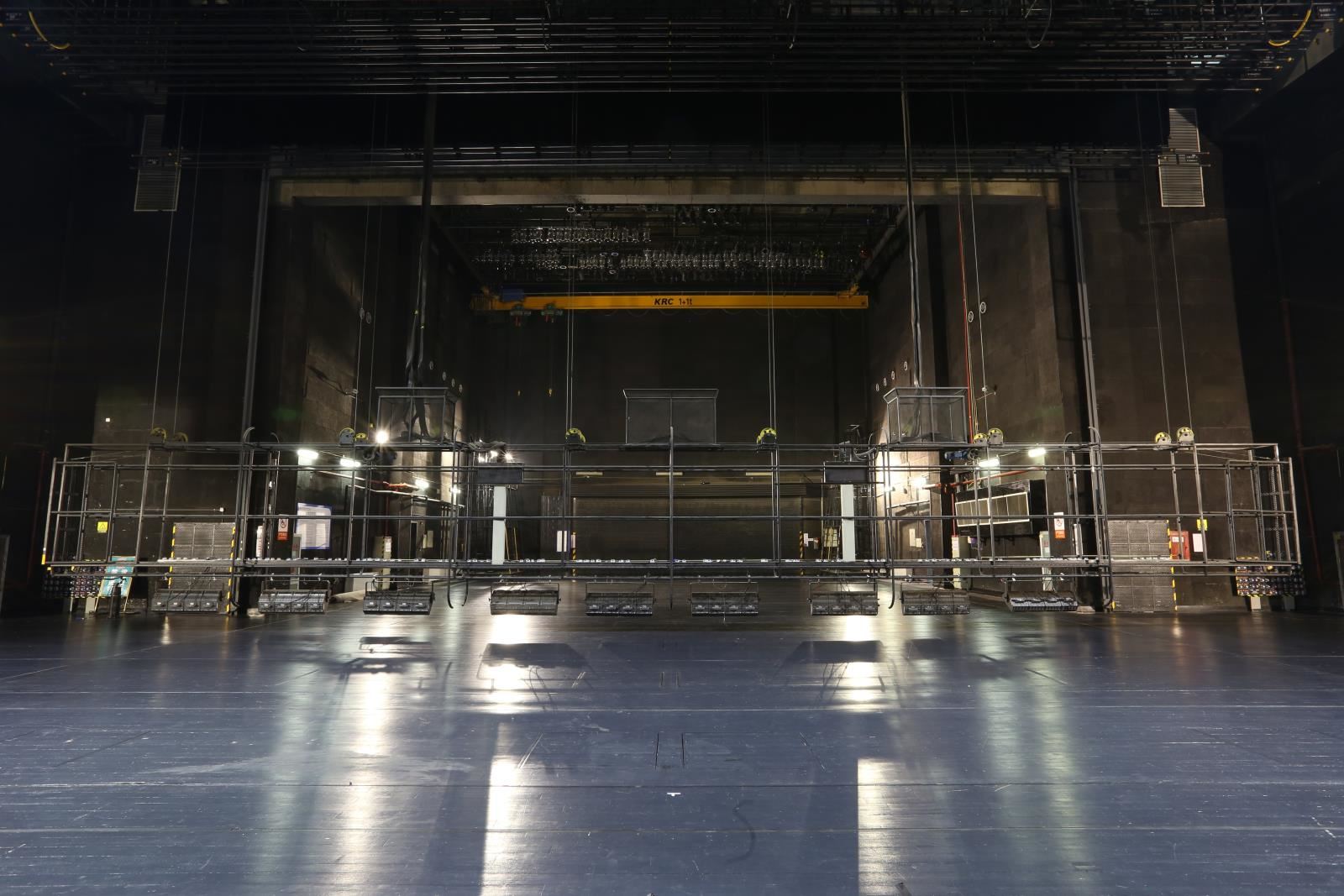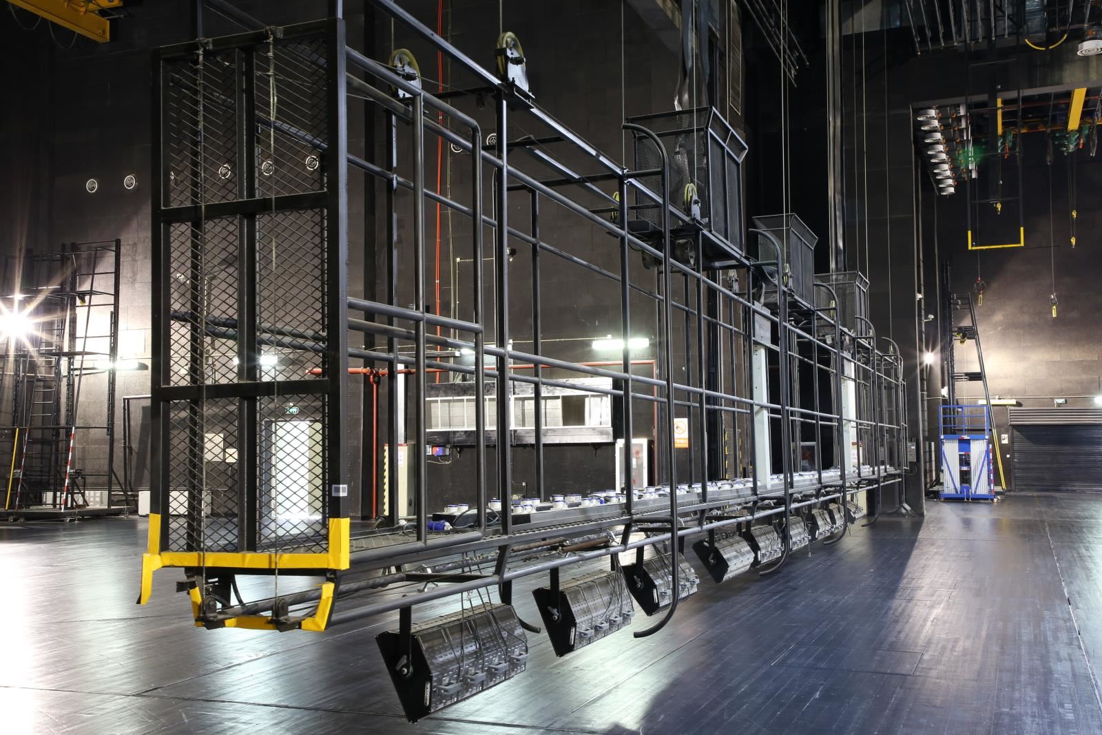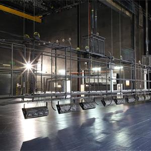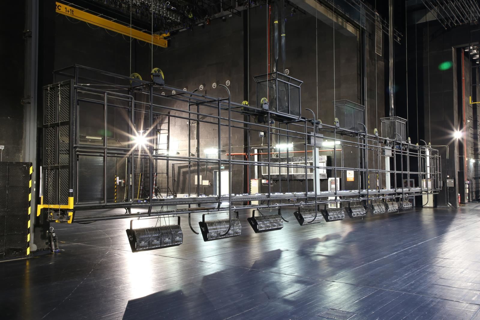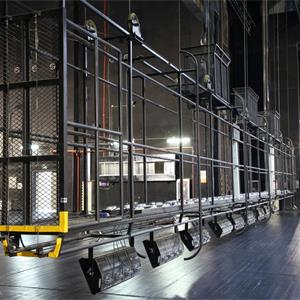 設(shè)置于主舞臺(tái)上空,用于吊掛舞臺(tái)燈具?,F(xiàn)在一般較少設(shè)燈光渡橋,如設(shè),較常設(shè)在主舞臺(tái)后區(qū)(即天幕景區(qū))上空。燈光渡橋與一層天橋通過(guò)“碼頭”相連,許可2名工作人員進(jìn)入燈光渡橋工作。碼頭形式一般為翻轉(zhuǎn)式,翻轉(zhuǎn)到位后固定于天橋上。燈光渡橋的兩側(cè)設(shè)計(jì)便于安裝燈具,設(shè)電纜收納裝置。一層天橋兩側(cè)與“碼頭”對(duì)應(yīng)位置各設(shè)一道安全防護(hù)門(mén)。天幕燈光渡橋上一般鋪設(shè)5mm厚的鋼板網(wǎng)(QB/T3896-1999)TL=22mm,TB=26mm,鋼板網(wǎng)上鋪設(shè)橡膠地板,型號(hào)為天然耐磨膠板,厚度為4mm。