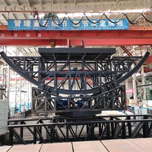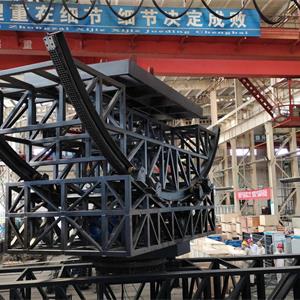 (3)海盜船動(dòng)作功能:大船的底部在長度方向?yàn)閳A弧面,船體可沿長度方向前后滑移,呈現(xiàn)在巨浪中前后擺動(dòng)的效果,且前后擺動(dòng)的幅度60°。
