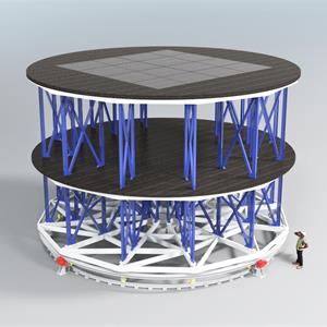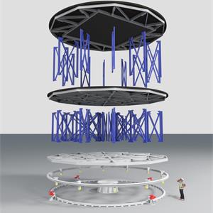 鼓筒轉(zhuǎn)臺設(shè)置于主舞臺靠近臺口一側(cè),為戲劇專用舞臺最重要的舞臺機械之一,鼓筒直徑Ф14~18m,通過臺體旋轉(zhuǎn)來滿足戲劇演出及遷換布景的需要。鼓筒式轉(zhuǎn)臺為雙層結(jié)構(gòu),采用回轉(zhuǎn)支撐方式。轉(zhuǎn)臺臺面上裝有升降臺或拼裝臺面。用于演出中轉(zhuǎn)化布景,以達(dá)到不同的舞臺布景效果。高配置型號升降臺可帶傾斜臺面。