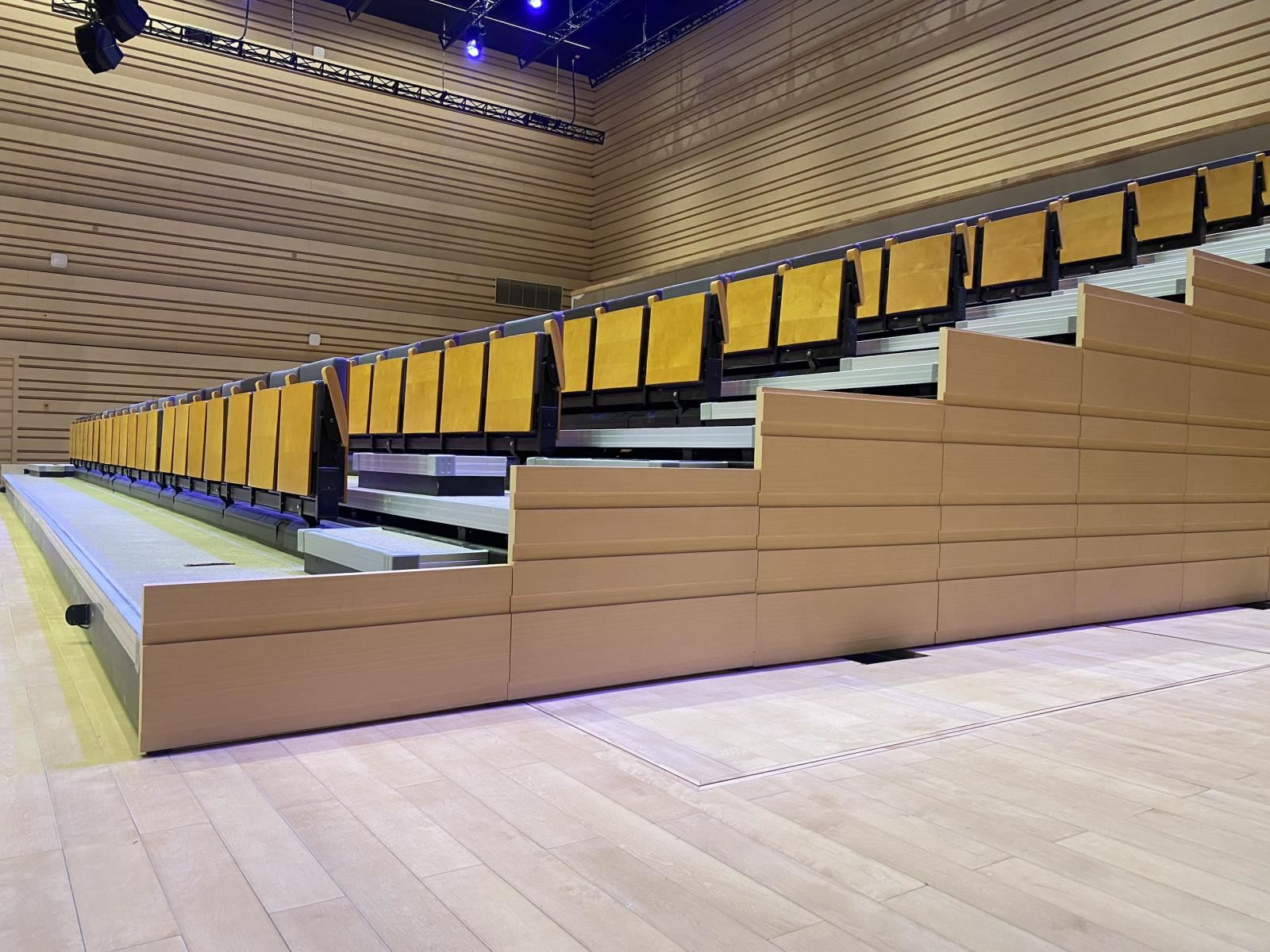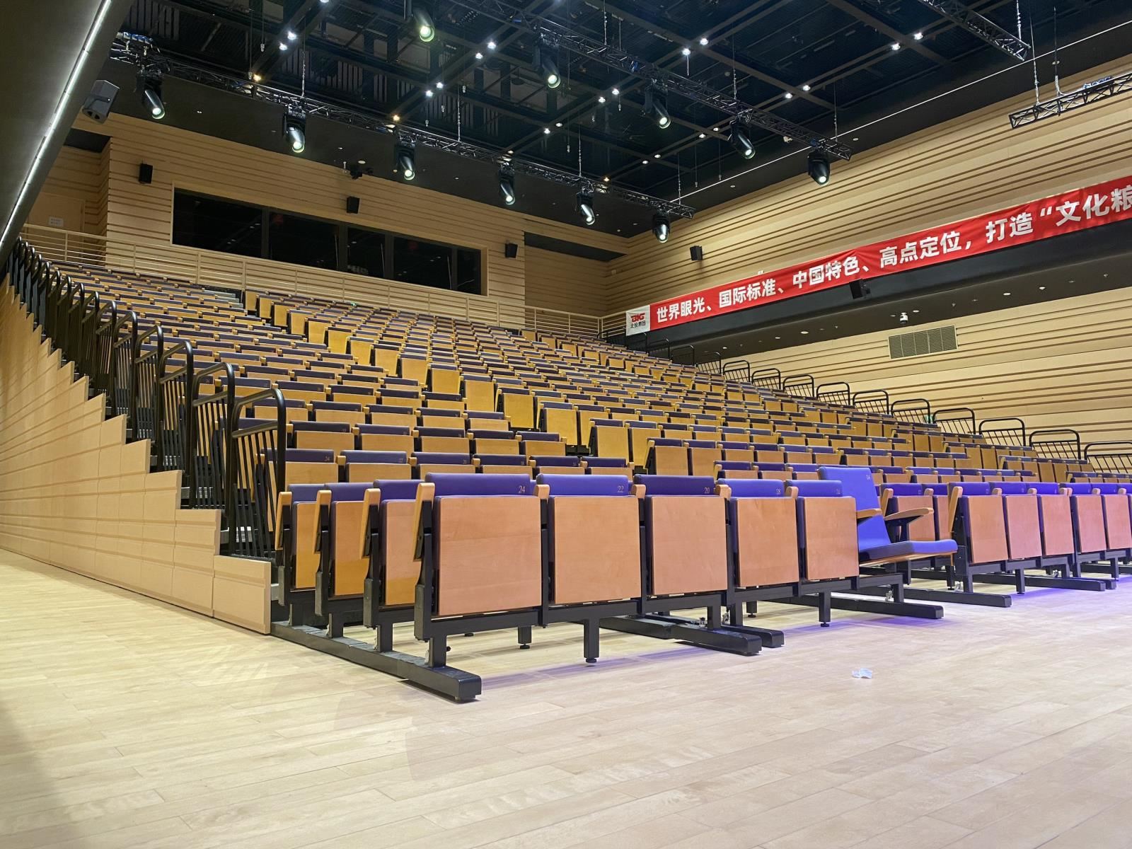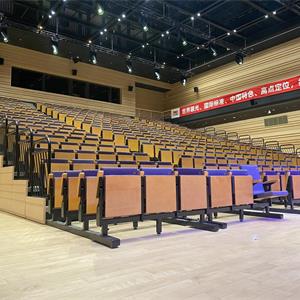 活動(dòng)看臺(tái)可電動(dòng)展開和收攏,當(dāng)排數(shù)較少時(shí),也可以采用人工的方式展開和收攏。